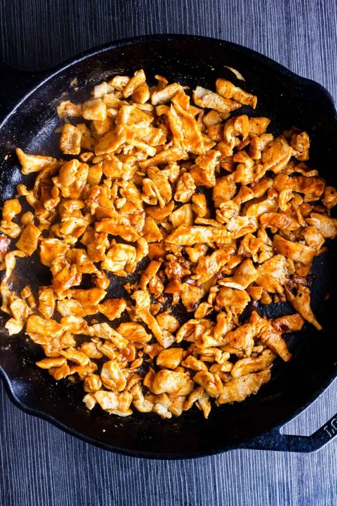 6. Meanwhile, add the chicken to the hot skillet, increase heat to high, and cook for 5-minutes, tossing occasionally, until slightly browned and cooked through.